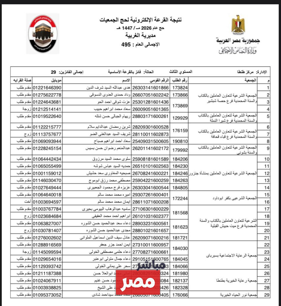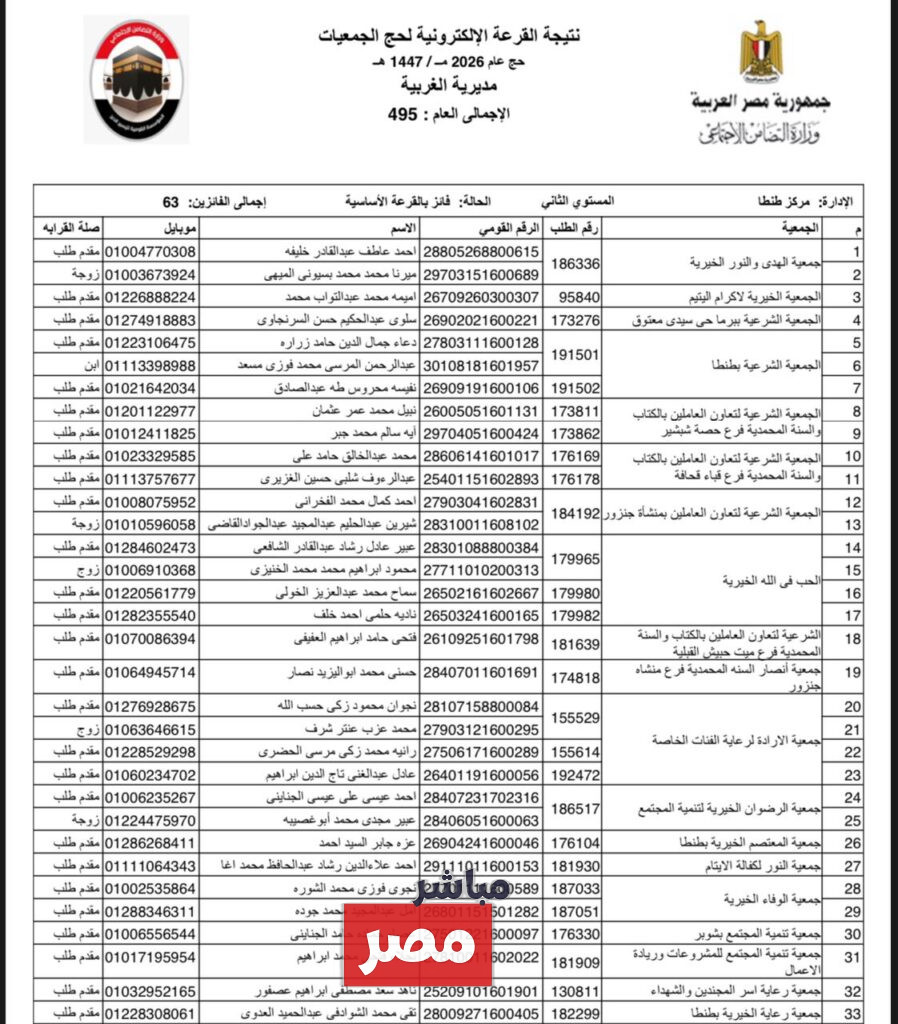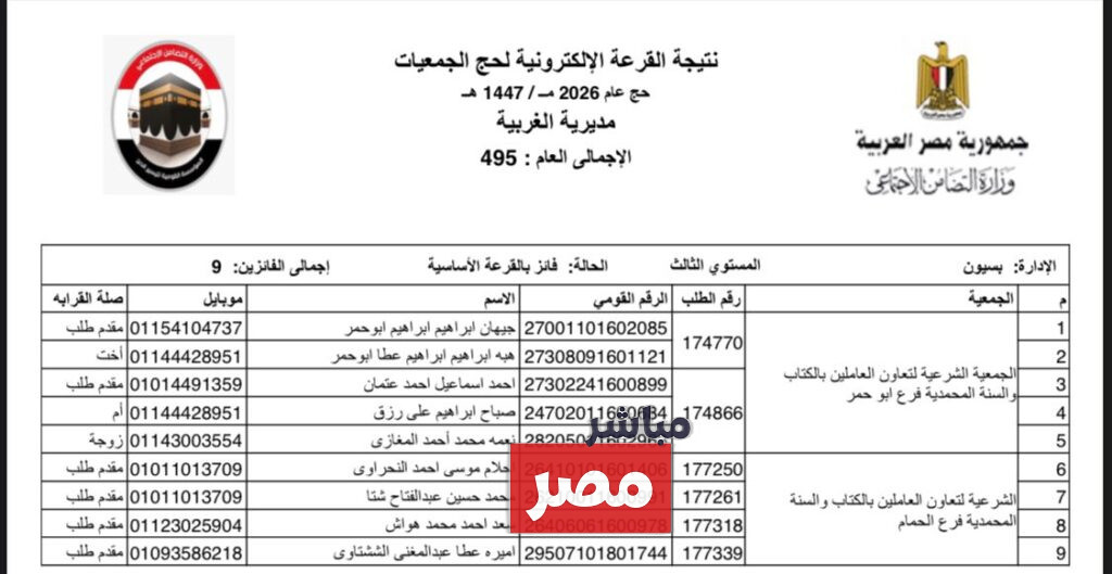 أعلن محافظ الغربية نتيجه قرعه الحج الجمعيات الأهلية لاختيار حجاج الجمعيات الأهلية لموسم 1447هـ، ووجه خالص تهانيه للمواطنين الذين حالفهم الحظ هذا الموسم ، واكد على أن عملية الاختيار تمت من خلال منظومة إلكترونية دقيقة تضمن أعلى معايير الشفافية والنزاهة، وأشاد انه هذه العمليه تمت تحت جهود وزارة التضامن الاجتماعي في إعداد وتنظيم المنظومة الإلكترونية للقرعة، والتي ساهمت في خروج الإجراءات بصورة متميزة ومنظمة، معربًا عن تمنياته بالتوفيق لمن لم يحالفهم الحظ هذا العام في فرص مقبلة، وفي هذا الصدد سنوضح لكم كافة التفاصيل المختصه بهذا الموضوع من خلال موقعنا الاخباري “مباشر مصر“.