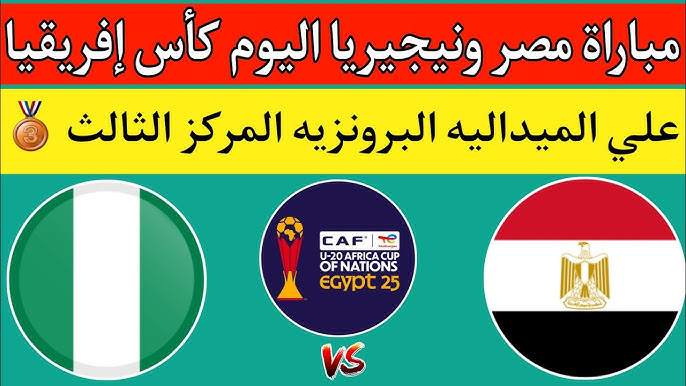 يستضيف ملعب محمد الخامس بمدينة كازابلانكا المغربية ماتش مصر ضد نيجيريا اليوم السبت 17 يناير 2026 لتحديد المركز الثالث والرابع في بطولة أمم أفريقيا، ومن المقرر أن تنطلق صافرة بداية المباراة في تمام الساعة 6:00 مساءً بتوقيت القاهرة، و7:00 مساءً بتوقيت السعودية، و8:00 مساءً بتوقيت الإمارات.