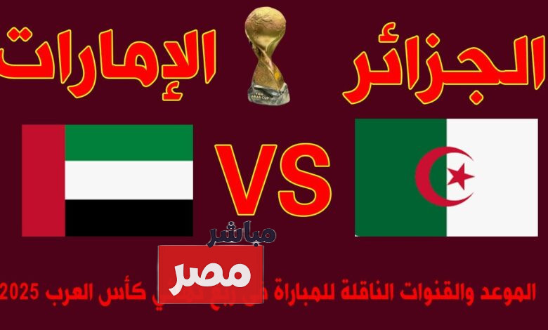 يبحث العديد من عشاق وجمهور كرة القدم بالسؤال عن القنوات الناقلة لمباراة الجزائر والامارات اليوم في الدور الربع النهائي من بطولة كأس العرب 2025 المقامة في قطر، حيث تمكن محاربو الصحراء من التأهل إلى هذا الدور بعد تصدرهم المجموعة الرابعة برصيد 7 نقاط، بينما جاء المنتخب الإماراتي في المركز الثاني بالمجموعة الثالثة برصيد 4 نقاط، من خلال موقعنا مباشر مصر ستتعرف على تفاصيل المباراة تابعونا.